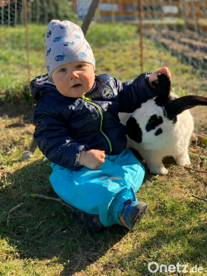 Denn für sie gilt keine Hoppelbeschränkung. Sie könnten ja vielleicht aus geheimen Quellen das ein oder andere bunte Ei fürs Osternest organisieren. Jakob geht jedenfalls taktisch klug auf Kuschelkurs mit Kaninchen Rudi. Das scheint auf diesem Gebiet schon ein alter Hase zu sein und lässt sich gelassen die Streicheleinheiten der kleinen Händchen gefallen.