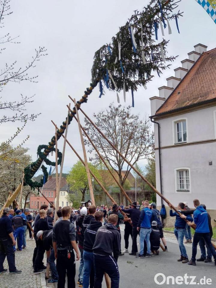 Viele Männer aus den örtlichen Vereinen stemmten den Püchersreuther Maibaum mit Hilfe von „Schwalben“ und ohne weitere Hilfsmittel in die Höhe. Ein großes Publikum verfolgte die Gemeinschaftsleistung aufmerksam und begeistert. Den Baum hatte wieder die Gemeinde gestiftet, für den Schmuck ist traditionell der Waldverein zuständig. Gemeinsam organisierten folgende Vereine auch einen Kaffee- und Kuchenverkauf sowie Brotzeit und Getränke für alle Helfer:
