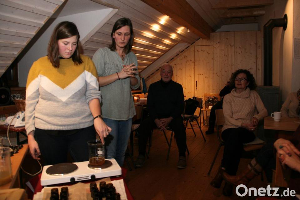 Zum Essen gibt es Butterbrezen, und wer möchte, Wildkräuterburger ohne Fleisch. Wer noch einen zuckersüßen Nachschlag möchte, darf sich ein Mohn-Marillen-Dessert bestellen, das fleißige Hände in der Glasschleif-Küche vorbereitet haben. Auf der heißen Herdplatte dampft eine Tinktur, die gleich fertig sein und umgefüllt wird. Apfeltee, Schlehen-Quitten-Punsch, aber auch gewöhnliches Mineralwasser stehen als Getränke bereit. An diesem geselligen Hutza-Abend wird für alle Geschmäcker gesorgt. "Beeren, Harze und Samen überdauern den Winter. Sie schenken uns vor allem in der staaden Zeit ihre Heilkräfte", erzählt Anja Putzer. Wie man die Tinkturen und Ölauszüge, aber auch Frischhaltefolien aus Lein und Bienenwachs herstellt, erläutern Conny Müller und Anja Putzer gemeinsam. Einige machen sich Notizen, um das gezeigte daheim nachmachen zu können.