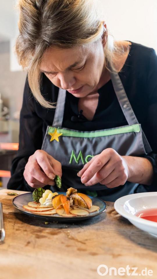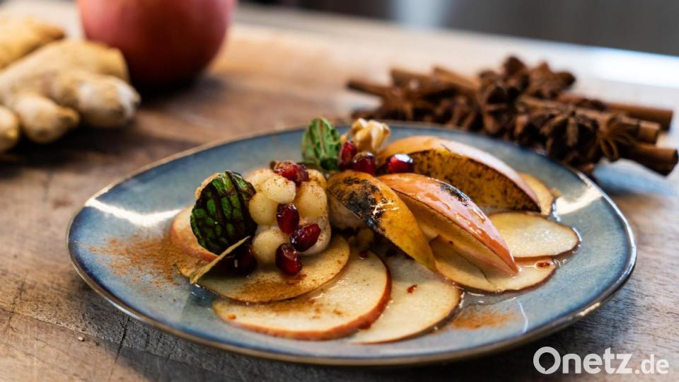 Zwar wird das Schneidbrett etwas angekokelt. Das sei durch Abschleifen aber leicht zu entfernen, versichert die Pullenreutherin. Die dritte Komponente sind Apfel-Kügelchen. Dafür Apfel halbieren und mit einem Kugelausstecher (Durchmesser circa 0,5 Zentimeter) etwa 28 kleine Bällchen ausstechen (pro Teller fünf bis sieben Kügelchen). Eine Marinade aus Orangensaft, etwas Orangenabrieb und Minz-Blättern herstellen. Hier muss nichts abgekocht werden. Die Apfel-Kügelchen darin wälzen. Jetzt geht es an das Anrichten. Das in Holundersirup getränkte Apfel-Carpaccio mit Mascarpone-Creme-Tupfen garnieren. Dazu die Creme in einen Spritzbeutel füllen und auf das Fruchtbett kleine Tupfen spritzen. Die geflämmten Apfel-Spalten und die Apfel-Kügelchen auf der Creme platzieren. Mit Zimt bestreuen, einige Granatapfelkerne darüber verteilen und mit Gemüse-Chips, sie werden in die Mascarpone-Creme gesteckt, garnieren.