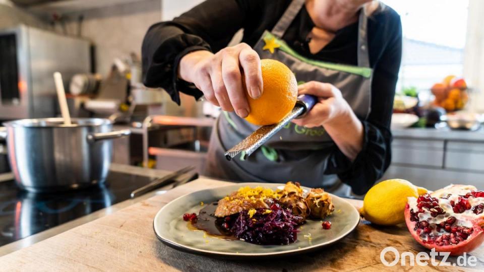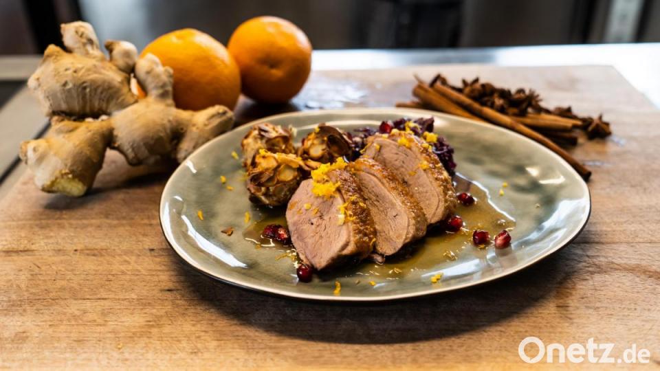 Zuerst geht es an die Hauptspeise. Apfel-Blaukraut steht auf dem Plan. Kraut und einen geschälten Apfel in dünne Streifchen schneiden. Zuerst klein geschnittene Zwiebeln in einer Pfanne mit Öl anschwitzen. Das Kraut dazugeben und kurz anbraten. Ablöschen mit Rotwein und die Apfelstreifen dazugeben. Für den Geschmack eine Zimtstange und Sternanis mit in den Topf geben. Das Apfel-Rotkraut für rund 25 Minuten auf niedriger Hitze köcheln lassen. Für das Zwetschgen-Gel den Saft der Frucht in einem Topf kurz aufkochen lassen. Sobald es kocht, das Agar-Agar hineingeben. Für den Geschmack eine Zimtstange und Sternanis in den Topf geben. Unter Rühren köcheln lassen. Zum Schluss mit einem Teelöffel Preiselbeeren verfeinern. Die eingekochte Zwetschgen-Masse durch ein Sieb in eine Schüssel geben und mindestens zwei Stunden kalt stellen. Weiter geht es mit dem Fleisch. Eine französische Barbarie-Entenbrust beidseitig salzen und pfeffern. Karotte, Sellerie, Zwiebeln und einen Apfel in zwei Zentimeter dicke Stücke schneiden. Das geschnittene Gemüse und der Apfel kommen zusammen mit der Ente auf einem Backblech bei 180 Grad Umluft für rund 25 Minuten in den Backofen. Nach zehn Minuten Backzeit die Ente mit Enten-Fond aufgießen und für weitere 15 Minuten in den Ofen geben.