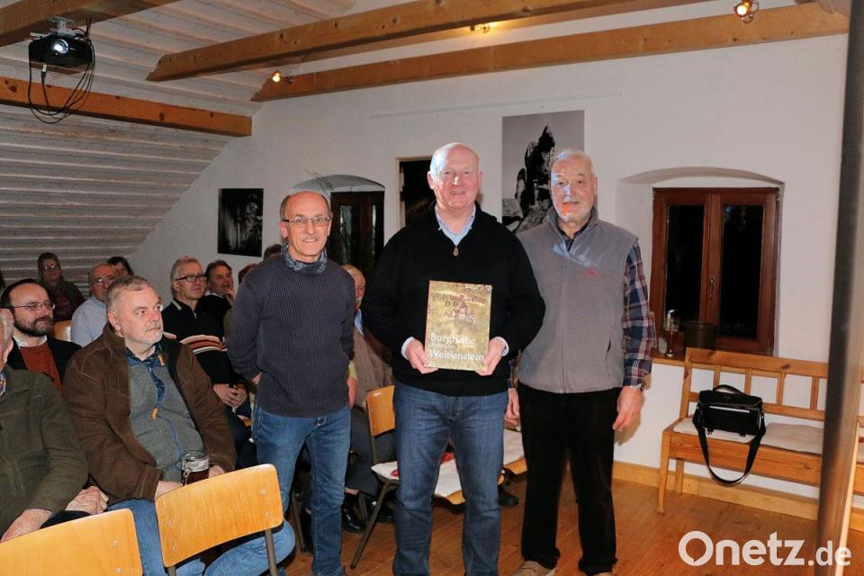 Dass die geheimnisvolle Skulptur überaus schwer zu finden sei, bestätigte auch Norbert Reger. "Nur am Nachmittag, kurz vor Sonnenuntergang, wenn die volle Sonnenstrahlung auf den Fels trifft, kann man sie deutlich erkennen", informierte der Vorsitzende und hatte an die Besucher gleich noch eine Bitte: "Wir suchen für die Figur auch noch einen Namen. Wenn euch was Passendes einfällt, schreibt uns." Dabei stand auch die Frage, was die Abbildung darstellt, im Mittelpunkt von Spekulationen. Unter großem Applaus überreichte abschließend an den Gewinner Jochen Weidner das kürzlich erschienene Buch "Burgruine und Herrschaft Weißenstein".