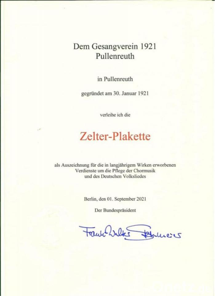 - Die Zelter-Plakette wurde 1956 vom damaligen Bundespräsidenten Theodor Heuss als staatliche Auszeichnung für Chorvereinigungen, die sich in langjährigem Wirken um die Chormusik verdient gemacht haben, gestiftet.