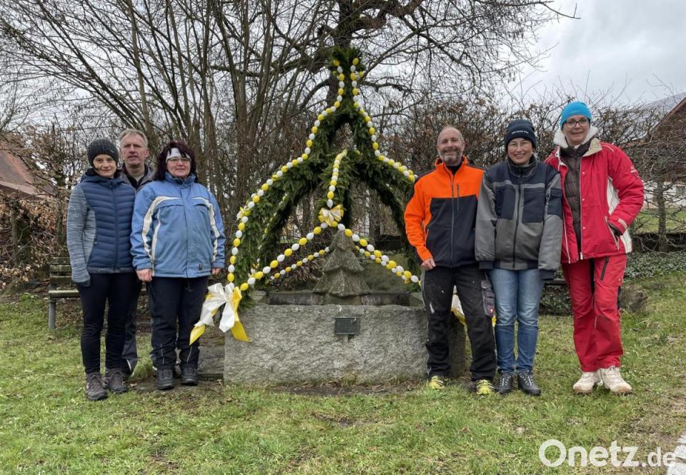 In Pullenried war Koproduktion angesagt: Der Brunnen bei der Kirche St. Vitus wurde mit zu einer Krone geformten Zweigen und weiß-gelben Eiern österlich geschmückt.