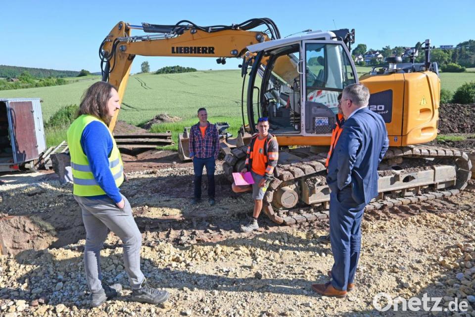 Oberbürgermeister Michael Cerny und Tiefbauamts-Mitarbeiter Markus Hermann schauten bei der Baustelle vorbei und ließen sich von den Mitarbeitern der Baufirma Englhard über den Baufortschritt informieren. Neben den städtischen Parzellen, mit einer Grundstücksgröße zwischen 475 und 580 Quadratmetern, werden zwei private Einzelhausgrundstücke erschlossen. Außerdem entstehen zwei öffentliche Parkplätze. Die Gesamtkosten für die Erschließung und die Begrünungsmaßnahmen betragen rund 260.000 Euro.