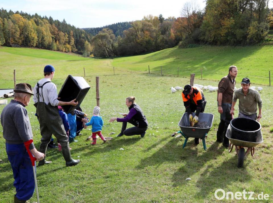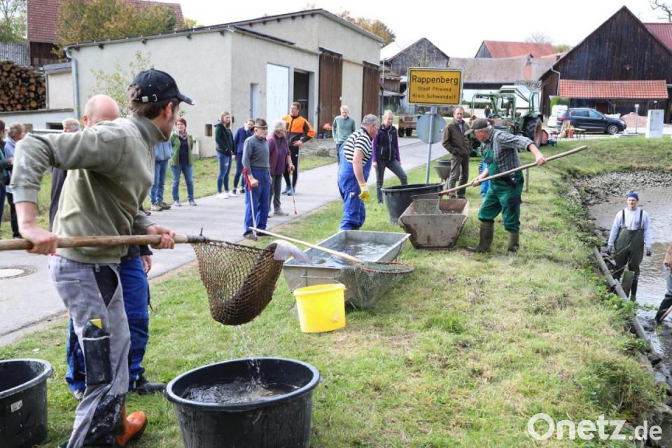 "Im letzten Jahr ist das Abfischen ausgefallen, weil es so trocken war", berichtet eine der Frauen, die amüsiert zuschauen, was das Wasser nun in diesem Jahr hergibt. Weil der Weiher auch als Löschteich für den Fall eines Brandes dient, hatte man es lieber nicht riskiert, ihn zu leeren. "Ein paar große fehlen noch", stellen die Männer fest, die gleich mit der Auswahl je nach Größe beginnen. Der "K1", also der einjährige Fisch muss zurück, auch der "K2" ist noch zu klein. Nur was schon ein paar Jahre hier schwimmt, ist groß genug für die Pfanne. Chef über die Rappenberger Teichwirtschaft ist in diesem Jahr Anton Zenger, der im Feuereifer des Sortierens nicht wenige Schlammspritzer abbekommen hat. "Der Posten geht jedes Jahr auf einen anderen Anteilseigner im Dorf über", erläutert Josef Bartmann. Die Frauen in dem Ort mit seinen 34 Einwohnern haben Kuchen gebacken und Kaffee gekocht, Bierbänke sind aufgestellt und ein kleines Lagerfeuer gibt es auch. "Nächstes Jahr sind wir hier 35", berichtet Josef Bartmann, der stolz darauf ist, dass sein Heimatort schon 1299 urkundlich erwähnt ist und 2013 die Goldmedaille bei "Unser Dorf soll schöner werden - unser Dorf hat Zukunft" gewonnen hat.