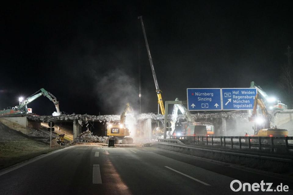 Der Verkehr wurde für die Dauer der Sperrung weiträumig um Regensburg herumgeleitet. Verkehrsteilnehmer konnten an den Anschlussstellen Regensburg-Universität, Regensburg-Burgweinting, Regensburg-Ost und Neutraubling weder auf- noch abfahren. Gleichzeitig wurden entlang der gesperrten Strecke vor allem Arbeiten an der Verkehrsführung durchgeführt. So floss nach Aufhebung der Vollsperrung der Verkehr zwischen den Anschlussstellen Regensburg-Ost und Neutraubling in beiden Fahrtrichtungen auf der südlichen Fahrbahn. Diese wurde dafür im zweiten Halbjahr 2019 bereits provisorisch verbreitert. Die Fahrspuren sind dennoch aus Platzgründen verengt - es gilt eine Höchstgeschwindigkeit von 80 Kilometern in der Stunde. Diese sogenannte Verkehrsumlegung wird in der kommenden Woche bereits vorbereitet: Ab Mittwoch fließt der Verkehr in Fahrtrichtung Passau bereits auf zwei nach außen gedrückten Fahrspuren. Die beiden Brücken über die A 3 mussten im Zuge des derzeit laufenden Autobahnausbaus abgerissen werden. Die Bauarbeiter rückten den Brückenbauwerken mit schwerem Gerät zu Leibe. Ingenieure schätzen, dass bei den Abbrucharbeiten am Wochenende mehr als 2000 Tonnen Schutt angefallen waren.
