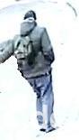 Mittleres Alter, zwischen 170 und 180 Zentimeter groß, bekleidet mit einer zu groß wirkenden, herunterhängenden blauen Jeans, einer hüftlangen, grünen oder grauen Winterjacke mit Kapuze. Zudem trug der Mann ein dunkles Baseball-Cap und hatte auf dem Rücken einen ebenfalls grünen oder grauen Rucksack bei sich.