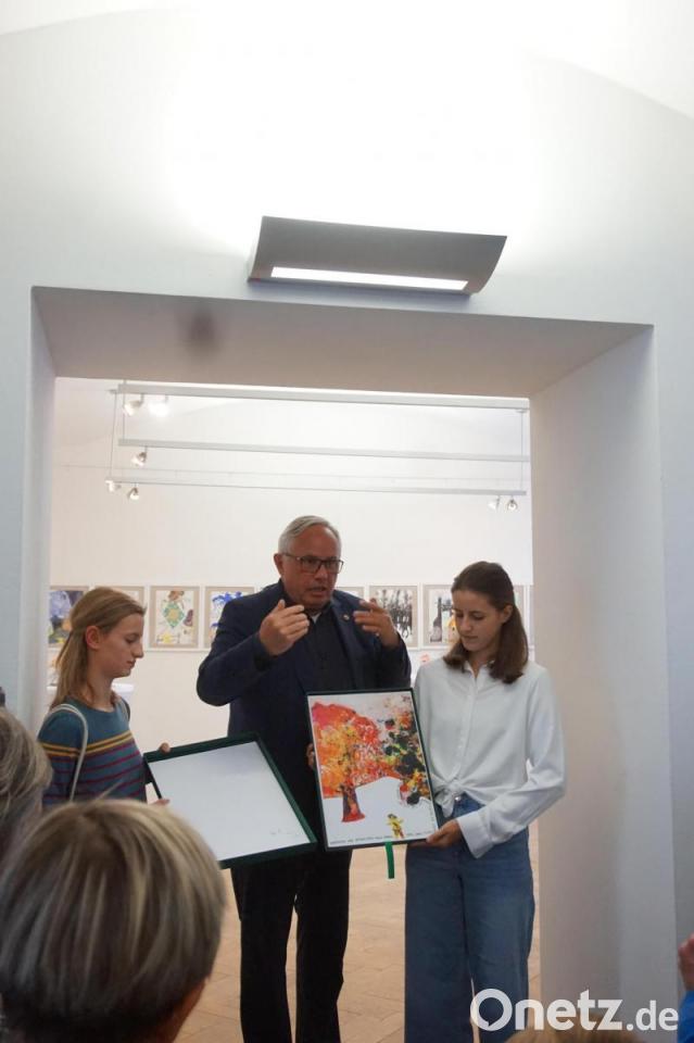 Viele der persönlichen Worte des Regierungspräsidenten stehen nicht im Redemanuskript, sie entfachen bei den Besuchern der Vernissage, zu 100 Prozent geimpft, wie positiv vermerkt wird, eine Atmosphäre, die erfahrene Gäste von Ausstellungseröffnungen als „selten erlebt“ kommentieren. Jürgen Huber ist nah am Luftsprung, als er versucht, seiner Stimmung Ausdruck zu geben. Er lüftet dann noch das Geheimnis, wie die Bilder entstanden, gut an der Collage mit dem roten Baum zu sehen: Ohne Plan formt der Künstler mit dem Pinsel einen roten Punkt, der wird größer. „Ja, es könnte ein Baum mit roten Blättern werden, wie jetzt im Herbst, wenn sich Laubbäume vom gelb, orange bis ins tiefe Rot verfärben. Dann folgt die künstlerische Verfeinerung und die Suche nach Worten für den Text“. Wer so an Bilder heran- und so sympathisch auf die Menschen zugeht, dem wird viel Applaus geschenkt. Der Zyklus erscheint auch als Druckwerk mit einer Auflage von 15 Exemplaren. Die Ausstellung ist noch bis 19. November zu sehen.