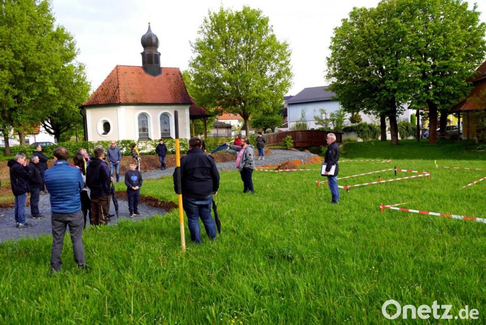 Der ungefähre Standort der Spielgeräte und die Größe des Bolzplatzes waren abgesteckt, der Standort des Maibaums markiert. Zu der Besprechung des "Gesellschaftsplatzes" begrüßte Bürgermeister Walter auch Ludwig Hafner vom Tiefbau der Verwaltungsgemeinschaft Kemnath. Es war seine letzte Amtstätigkeit. Den mitgebrachten dicken Aktenordner mit den Grundrissplänen und Unterlagen wird er zum Ende des Monats an seinem Nachfolger übergeben. Zum Auftakt der Arbeiten werden der serpentinenförmige, barrierefreie Zugang von der Kapelle zum Dorfplatz und der anschließende Sitzbereich gepflastert. Der Gehweg wird mit 16 mal 16 großen Granitsteinen eingefasst. Für den Weg selbst und den Sitzbereich ist ein Betonpflaster von 10 mal 20 Zentimetern vorgesehen.