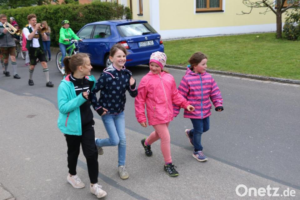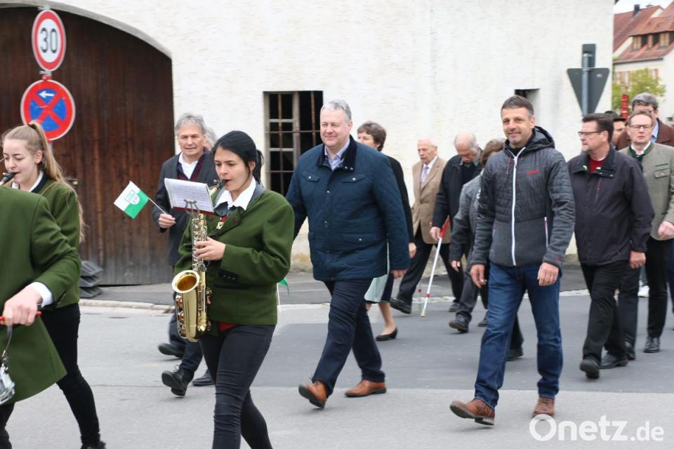 Die Blaskapelle St. Georg Rieden führt den Festzug an. Dahinter folgte Ehrenschirmherr Landrat Richard Reisinger mit Zweitem Bürgermeister Josef Weinfurtner und Marktgemeinderat Jürgen Färber.