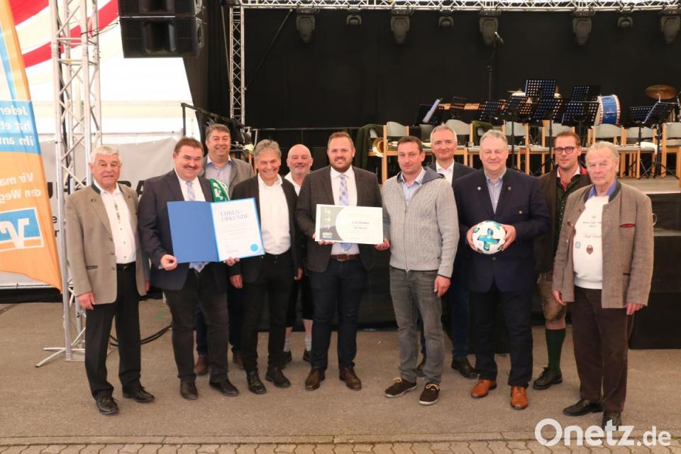 BFV-Kreisvorsitzender Albert Kellner überreichte dem FC Rieden die Ehrenurkunde des BFV und einen Spielball.