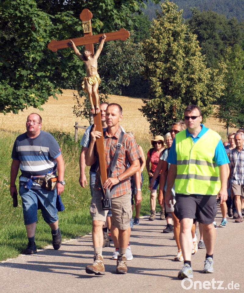 (sön) Zum 315. Mal pilgerte am vergangenen Samstag die katholische Pfarrgemeinde zum rund 30 Kilometer entfernten Habsberg. "Geleite sie auf ihrem Weg, schütze sie vor Gefahr, behüte sie vor jedem Unfall und lasse sie heil zurückkehren" bat vorher Pfarrer Gottfried Schubach in der Pfarrkirche "Mariä Himmelfahrt." Nach einem gemeinsamen Vater unser und Ave Maria erteilte er den Reisesegen. Beim gemeinsamen Lied "Wir ziehen zur Mutter der Gnaden, zu ihrem heiligen Bild" formierten sich die etwa 100 Wallfahrer auf dem Marktplatz um bei sommerlichen Temperaturen zur Wallfahrtskirche "Maria Heil der Kranken" auf dem Habsberg aufzubrechen. Als Vorbeter waren Hubert Fischer, Andreas Fischer, Georg Müllner und Reinhard Meier im Einsatz. Das sechs Kilogramm schwere Wallfahrtskreuz wurde nach Habsberg, wo man gegen 16.30 Uhr ankam, von Xaver Riepl jun. getragen, auf dem Rückweg übernahm Christian Huber diese Arbeit. Den Lautsprecher trug Klaus Jaintzyk. Nach der Ankunft verweilten die Gläubigen bei einer Andacht in der Gnadenkapelle. Das Wallfahrtsamt, dem sich eine Lichterprozession anschloss, wurde mit Pfarrer Dr. Elmar Spöttle gefeiert und von der Blaskapelle Rieden musikalisch umrahmt. Die Wallfahrtskirche war mit mehreren hundert Gläubigen bis auf den letzten Platz gefüllt. Am Sonntag-Morgen pilgerten nach der morgendlichen Verabschiedung knapp 50 Pfarrangehörige zurück nach Rieden wo sie gegen 16.30 wieder glücklich aber doch ein bisschen müde von den Angehörigen empfangen wurden. Mit 89 Jahren war Konrad Ibler, der zum 64. Mal teilnahm, ältester Teilnehmer dieser Wallfahrt. Mit ihm auf den Weg gemacht hatte sich auch seine Tochter Sabine Rüth, seine Enkel Andreas Ibler. Sabine und Jakob Rüth sowie seine Urenkel die Zwillinge Max und Leo Ibler. Der achtjährige Moritz Breitkopf und die neunjährige Eva Hocfrichter waren als jüngste Pilger mit dabei. Da keine Gaststätten mehr auf der Strecke vorhanden sind, übernahm die Feuerwehr Rieden die Essens- und Getränkeversorgung.