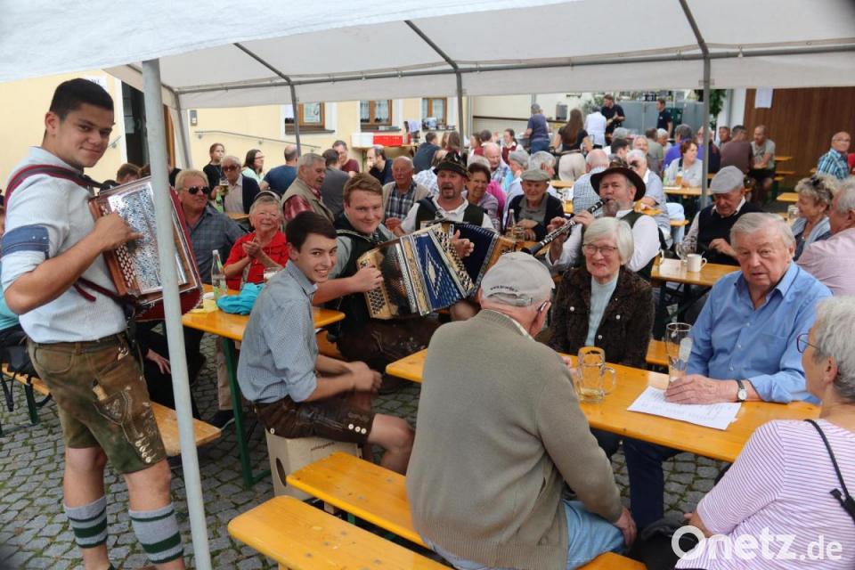 Vor dem Pfarrheim erwartete die Gäste, die auch aus den Nachbarlandkreisen zahlreich nach Rieden gekommen waren, sauere Bratwürste und Rosswürste von der Riedener KAB. Die Mitglieder hatten außerdem ein umfangreiches Kuchen- und Tortenbuffet aufgefahren. Nicht fehlen durften die beliebten Riedener Kücheln. Dazu spielte die Blaskapelle St. Georg Rieden auf. Außerdem gingen bekannte Musikgrößen wie der Bose und der Fonse durch die Reihen und erheiterten die Gäste mit feinsinnigen Stücken und Gstanzln.