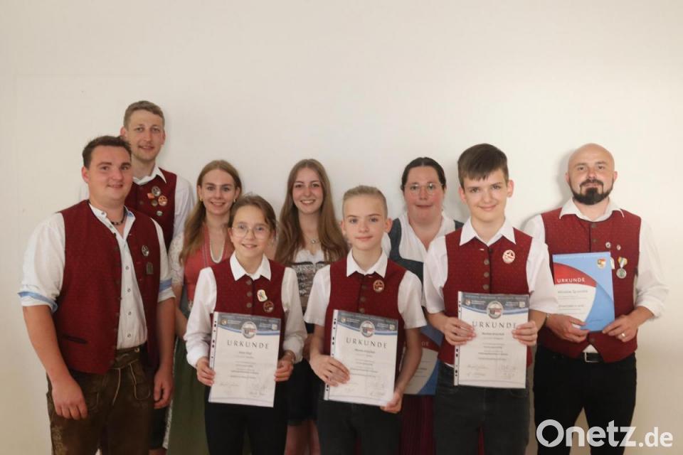 Vorsitzender Sebastian Zapf nutzte die Gelegenheit, in diesem tollen Rahmen verdiente Musikanten zu ehren. Für fünf Jahre als aktive Musikerinnen wurden Nathalie und Evelyn Kryschak geehrt. Zehn Jahre spielen Elena Haas und Emma Färber auf, 20 Jahre Anja Hofauer. Eine besondere Ehre wurde dem Dirigenten Miroslaw Zgrzendek zuteil, er musiziert bereits seit 30 Jahren aktiv in der Blaskapelle und erhielt dafür wie auch die anderen Geehrten eine Ehrennadel. Für das erreichte Leistungsabzeichen D 1 in Bronze bekamen eine Ehrennadel mit Urkunde Anna Kopf, Bastian Kryschak und Nicolas Kryschak. Für dieses Leistungsabzeichen hatten die drei Nachwuchsmusiker einen Vorkurs mit anschließender Prüfung in Sulzbach-Rosenberg absolviert. Auf den Erfolg der nächsten Generation ist man im ganzen Verein sehr stolz.