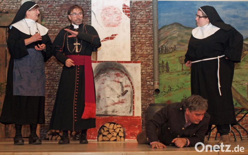 Da er sich nicht von Schwester Rabiata behandeln lassen will, bittet der Pfarrer die Oberin um eine Flasche Klosterfrau-Narzissengeist: "Zum Einreiben, nicht zum Trinken natürlich." Da taucht aus dem Stall die älteste und schwerhörige Nonne Appolonia (Regina Schnabel) auf, zuständig fürs Schnapsbrennen und Bierbrauen. Sie hört nicht nur schlecht, sie läuft halbblind durch die Gegend. Ihr Schnapsflascherl in der Hand, schnüffelt sie daran und jammert: "Da fehlt etwas an meinem Klosterfrau-Narzissengeist und ich komm zum Verrecken nicht drauf."
