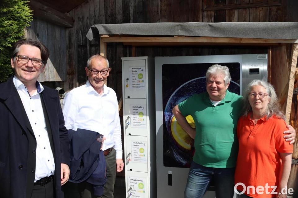 Direkt am Vilstalradweg im Biergarten der Gaststätte „Radlschupfa“ in Rieden können E-Bike-Fahrer gleichzeitig die eigenen Akkus bei einem Getränk und einer Brotzeit aufladen, aber auch die Batterie ihres E-Bikes. Kommunalbetreuer Markus Windisch von der Bayernwerk Netz GmbH übergab an Bürgermeister Erwin Geitner für die Marktgemeinde Rieden als Spende des Netzbetreibers eine Elektroladestation für Fahrräder. „Wir wollen damit in den Kommunen umweltschonende Mobilität fördern und Lust machen aufs Rad“, erklärte Windisch. Geitner erachtete das Gasthaus "Radlschupfa" direkt am Vilstalradweg als idealen Standort. Wie dessen Besitzer Jürgen und Barbara Lipp erklärten, betreibe man auf der Gaststätte eine 13-Kilowatt-Photovoltaikanlage, deren regenerativen Strom Radfahrer für ihr E-Bike, aber auch für das Handy nutzen können.