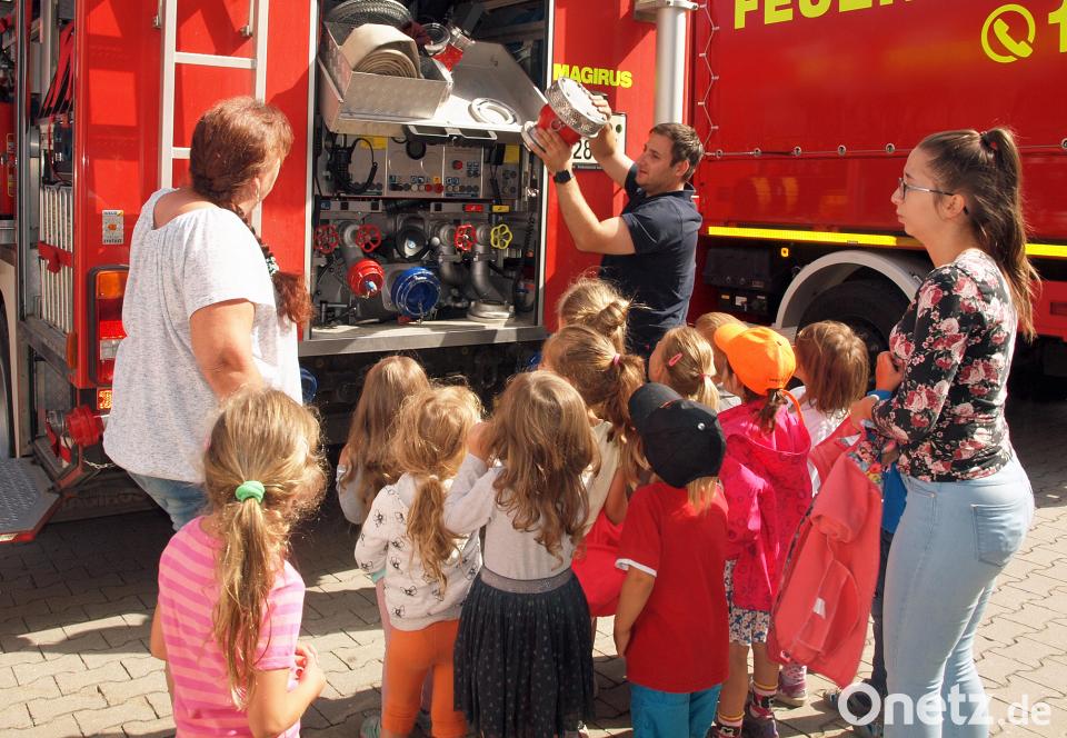 Als die Fahrt mit dem Feuerwehrauto anstand, wollte jeder der Erste sein. Die Feuerwehr-Fans kamen voll auf ihre Kosten. Nach einem Probelöschen mit der Kübelspritze waren die Kinder mit ihren Erzieherinnen noch zu warmen Wienern mit Semmeln und Getränken eingeladen. Sie freuten sich auch über Süßigkeiten und Drachen von Reinhard Meier.