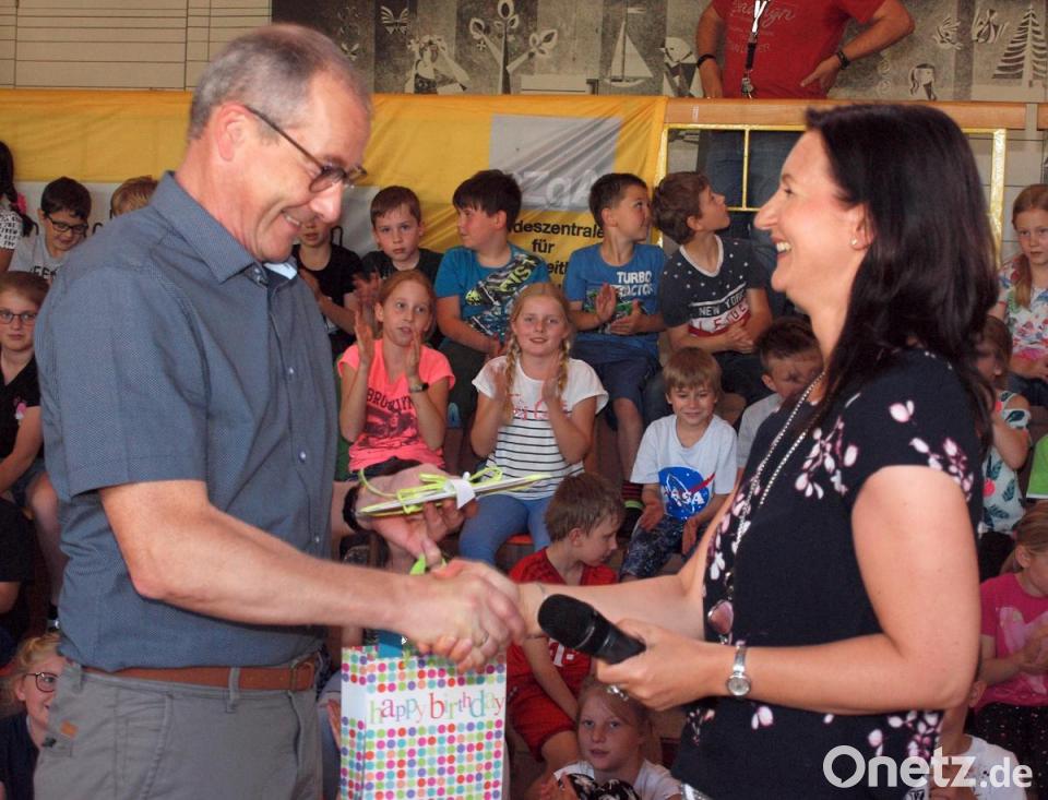Geitner hatte schließlich gerade seinen 50. Geburtstag. Rektorin Christine Kölbl wusste, dass Geitner nur im Familienkreis feiern wollte - die Schulfamilie wolle aber trotzdem gratulieren und danken für das stets offene Ohr des Bürgermeisters, wenn es um die Belange der Schule gehe. Die Kinder hatten sich etwas Besonderes ausgedacht. Sie schenkten ihm Streichhölzer "damit Sie immer eine zündende Idee haben", Brillenputztücher "für einen immer klaren Durchblick", einen Glücks-Cent, "damit Sie immer Kleingeld in der Tasche haben", Traubenzucker für genug Energie, einen Faden, "damit Sie nie den roten Faden verlieren", Büroklammern, um seine Gedanken zusammenzuhalten, eine Batterie, falls mal der Akku leer ist und Buchstabennudeln, "falls Ihnen mal die Worte fehlen". Dazu gab's eine große, aus Teelichten zusammengesetzte "50" zum Ausblasen.