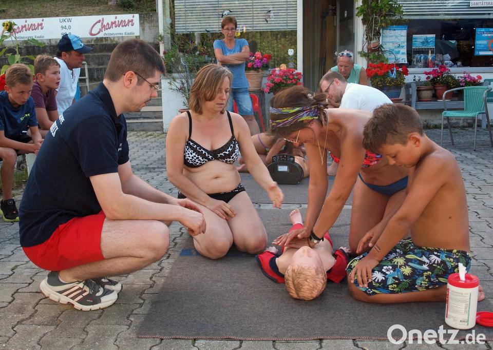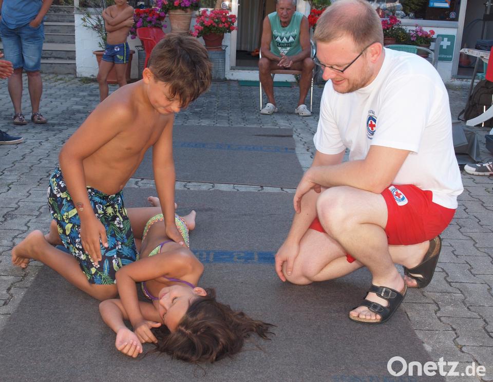 Graf und Gebhardt zeigten, was getan werden muss, wenn man eine Person auffindet, die dringend Hilfe braucht. "Ansprechen und Anfassen, Notruf absetzen, Atem- und Mundkontrolle, damit die Person nicht an Erbrochenem erstickt." Dann sollte die Person in die stabile Seitenlage gelegt werden. Das übten die Badbesucher fleißig.
