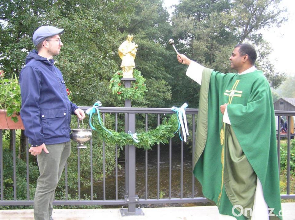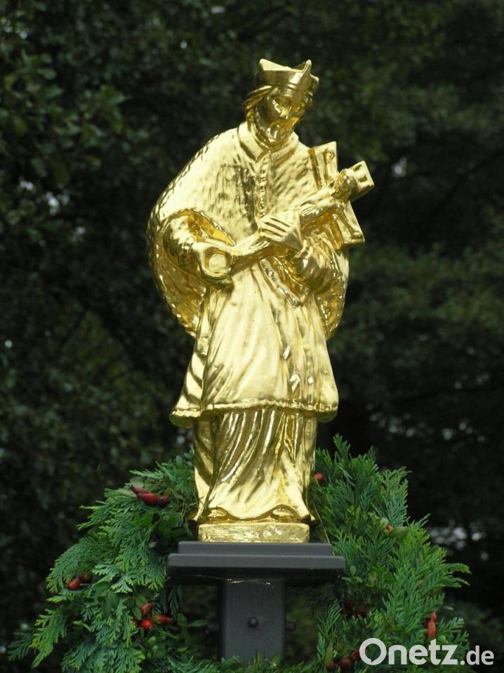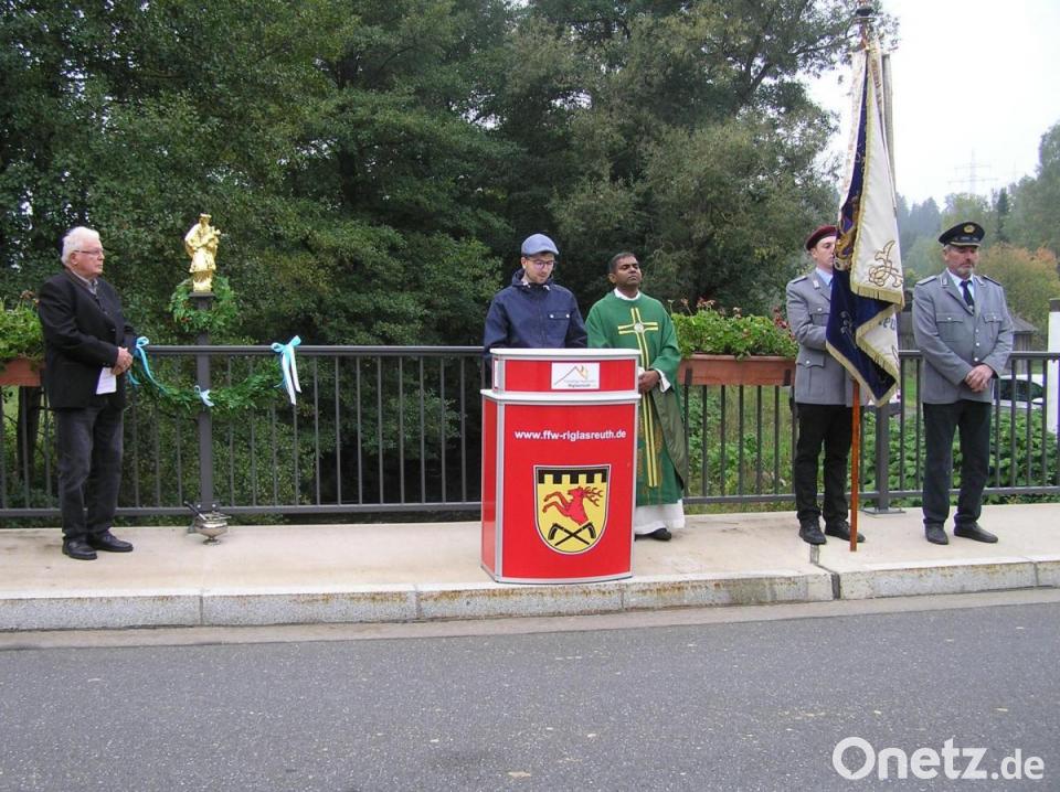 Die vergoldete Figur des Brückenheiligen Sankt Nepomuk an der Ortseinfahrt von Riglasreuth erhielt vor Kurzem ihre kirchliche Weihe. Pfarrer Julius Johnrose segnete die Statue. Im Anschluss an den Gottesdienst in der Filialkirche Sankt Wolfgang zogen die Gläubigen zur Fichtelnaabbrücke. Zu Beginn der Feierstunde begrüßte Richard Stock als Vorsitzender der Flurbereinigungsteilnehmerschaft Riglasreuth-Weihermühle den Geistlichen, Neusorgs Bürgermeister Peter König, dessen Stellvertreter Oliver Becher, das Restauratorenteam von der Holzschnitzerei Gerhard Schinner und alle Vertreter der Vereine sowie deren Fahnenabordnungen.
