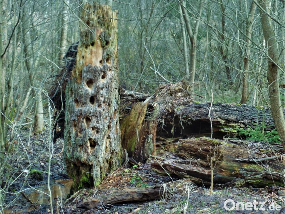 Ein Spaziergang in diesen Tagen bietet überraschende Einblicke in die Natur. In den meisten Monaten verbirgt dichtes Laub so manches, was jetzt bei kahlen Bäumen und Büschen plötzlich ins Auge fällt. Es haben sicher etliche Spechte eine prima Mahlzeit in dem alten Fichtenstrunk gefunden, der da so durchlöchert unterhalb des Röthenbacher Rablmühlweihers im sumpfigen Gelände sichtbar wird. „Mahlzeit, oder, nicht schlecht Herr Specht“, möchte man dazu sagen, auch wenn sich gerade kein Vogel blicken lässt. In ein paar Wochen wird diese Futterstelle schon wieder von grünen Blättern verdeckt sein.