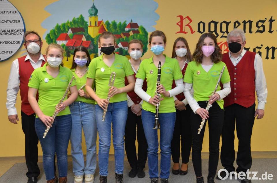 Kapellmeister Josef Wolfrath kümmert sich seit Jahrzehnten um den Musikernachwuchs der Roggensteiner Jugendkapelle. Kürzlich hatten sich fünf Musikerinnen und Musiker den Anforderungen des Musikleistungsabzeichens des Bayerischen Blasmusikverbands beim Nordbayerischen Musikbund in Sulzbach-Rosenberg, Velburg und Neunkirchen am Brand gestellt und mit Bravour bestanden. Die Prüfungserfolge feierten Wolfrath und Vorsitzender Ferdinand K. Münch am Freitag vor der Probe. Das D-1-Bronzeabzeichen erhielten Emily Hinderlich (Querflöte) und Alexander Ram (Flügelhorn). Johanna Zitzmann und Lena Dworzak (beide Querflöte ) und Julia Herold (Klarinette) absolvierten das D-2-Abzeichen in Silber. Das D-3-Goldabzeichen steckte Wolfrath stolz der 14-jährigen Fiona Müllner (Querflöte) an. Damit erhält sie gleichzeitig die Lehrbefugnis. Seit zwölf Jahren werden bei der Jugendkapelle Jugendliche in Theorie und Praxis auf die Prüfungen vorbereitet. Allerdings schafften bisher nur vier Musiker das Goldabzeichen.