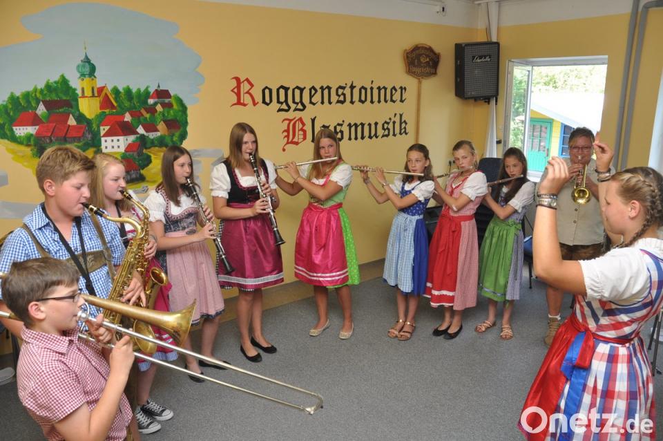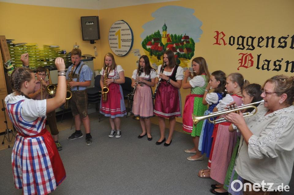 Vor wenigen Tagen, am Sonntag, 29. Juli, stand nun der erste offizielle Auftritt der zehnköpfigen Formation beim Gottesdienst für die verstorbenen Mitglieder vor der Fahrzeugsegnung in der Roggensteiner Pfarrkirche St. Erhard an, der sofort überzeugte und die Kirchenbesucher begeisterte. Es war der besondere Wunsch des Kapellmeisters, dass Sophia Haupt diese Gruppe leiten soll und die junge Dame war nicht abgeneigt und sagte spontan zu. Und das, obwohl bereits mit Ellen Gesierich eine gestandene Trompeterin dabei ist. Doch die routinierte Nachwuchsdirigentin weiß, was sie will und kann sich auch in der Gruppe durchsetzen. Das blieb auch Wolfrath nicht verborgen. Immerhin durchlief Sophia Haupt schon erfolgreich sämtliche D-Prüfungen von 1 bis 3 und den Grundkurs Stimm- und Registerführer, der sie zur Leitung eines Ensembles oder einer kleinen Gruppe befähigt. Vincent Fenzl (Posaune), Florian Hilburger (Tenorsaxophon), Johanna Stubenrauch (Altsaxophon), Hannah Grosser und Madlen Koller (Klarinette), Sophia Koller, Lena Dworzak, Fiona Müllner und Sophia Schuller (Querflöte) und Ellen Gesierich (Trompete) haben sich unter diesem neuen Namen "Blechana Hulzhafa" vereint und üben immer mittwochs nach den Einzelproben noch gemeinsam in der Gruppe. "Wir wollen jetzt erst einfach das Zusammenspiel mit den anderen Instrumenten einstudieren", versichert Sophia Haupt. Sozusagen als Vorstufe für die Blaskapelle.