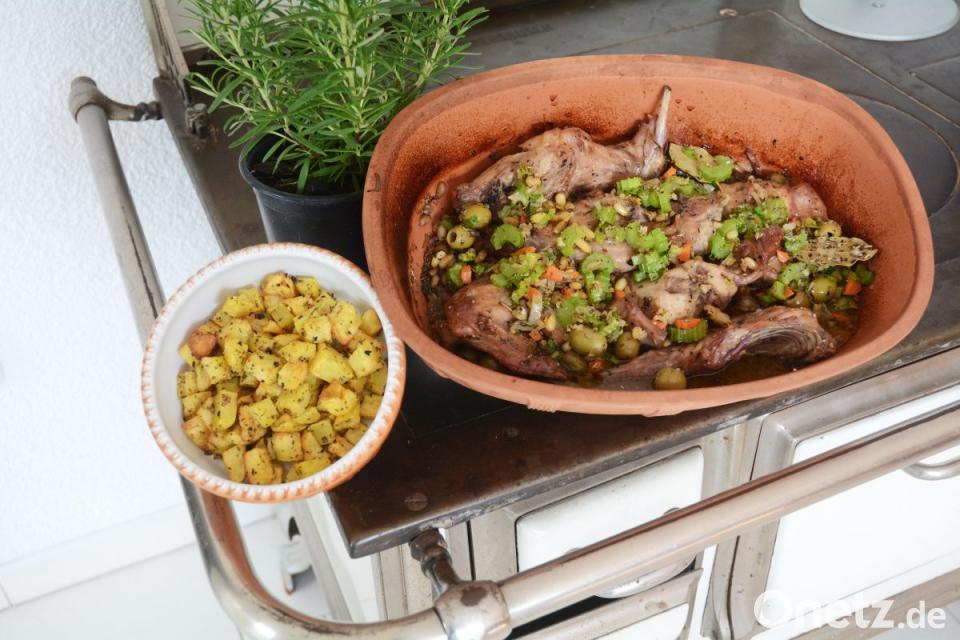 Zubereitung: Das Kaninchen in Portionsstücke schneiden und waschen. Abtupfen und mit Olivenöl einpinseln. Anschließend mit Salz und Pfeffer würzen. Stangesellerie und Möhre waschen. Schalotten und Möhre schälen. Das Gemüse in Würfel schneiden. Den Knoblauch schälen und hacken. Die Kräuter und die Walnüsse ebenfalls hacken. In einer Pfanne das restliche Olivenöl erhitzen und den gehackten Knoblauch hineingeben. Darin die Kaninchenstücke kräftig anbraten. Das Gemüse, die Kräuter, Oliven und Nüsse zugeben und mit anbraten. Mit Rotwein ablöschen. Den Backofen auf 170 Grad vorheizen. Alles in eine feuerfeste Form geben und abgedeckt im Ofen rund eine Stunde schmoren. Wenn nötig mit der Gemüsebrühe Flüssigkeit nachfüllen. Für die Rosmarinkartoffeln die Kartoffeln schälen und in Würfel schneiden. Rosmarin waschen, abtupfen und fein hacken. Knoblauch schälen, hacken und mit dem Olivenöl, Salz und Pfeffer unter die Kartoffelwürfel mischen. Ein Backblech mit Backpapier auslegen. Die Kartoffeln darauf verteilen. Im auf 250 Grad vorgeheizten Backofen rund 25 Minuten garen bis sie goldgelb sind. (nd)