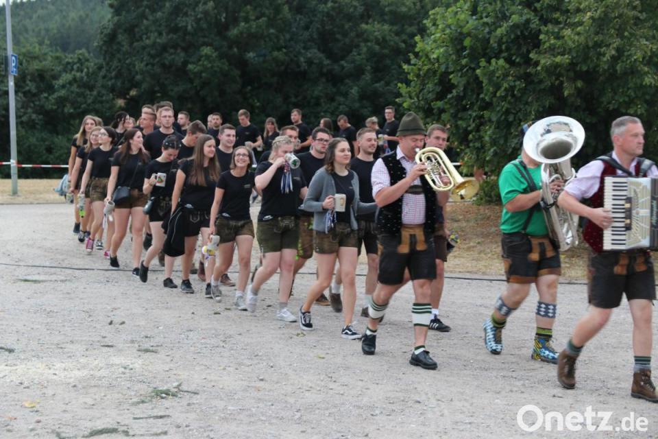 Es dauerte eineinhalb Stunden, bis der stattliche Baum bei der Rottendorfer Dorfkirchweih in die Senkrechte gehievt war. Nach getaner Arbeit hatten die Kirwaburschen nicht lange Zeit durchzuschnaufen, denn sie mussten sich für den Auftakt der Kirchweih am Abend fertig machen. Die 21 Paare trafen sich vor dem Feuerwehrhaus in Schmidgaden, wo sie von den Ehrengästen und der Musikkapelle "Wöidarawöll" abgeholt wurden, um in das Festzelt einzuziehen. Dort hieß der Vorsitzende der Feuerwehr Rottendorf, Helmut Ries, die Gäste willkommen.