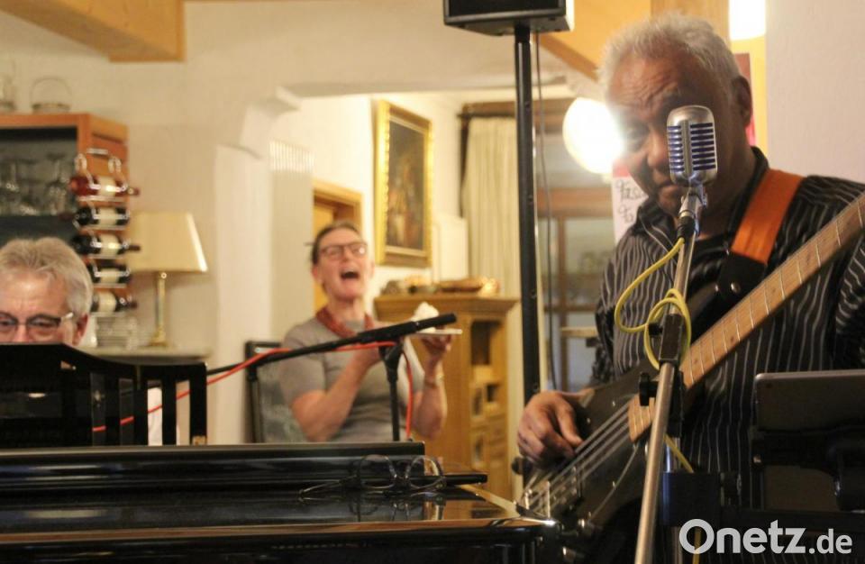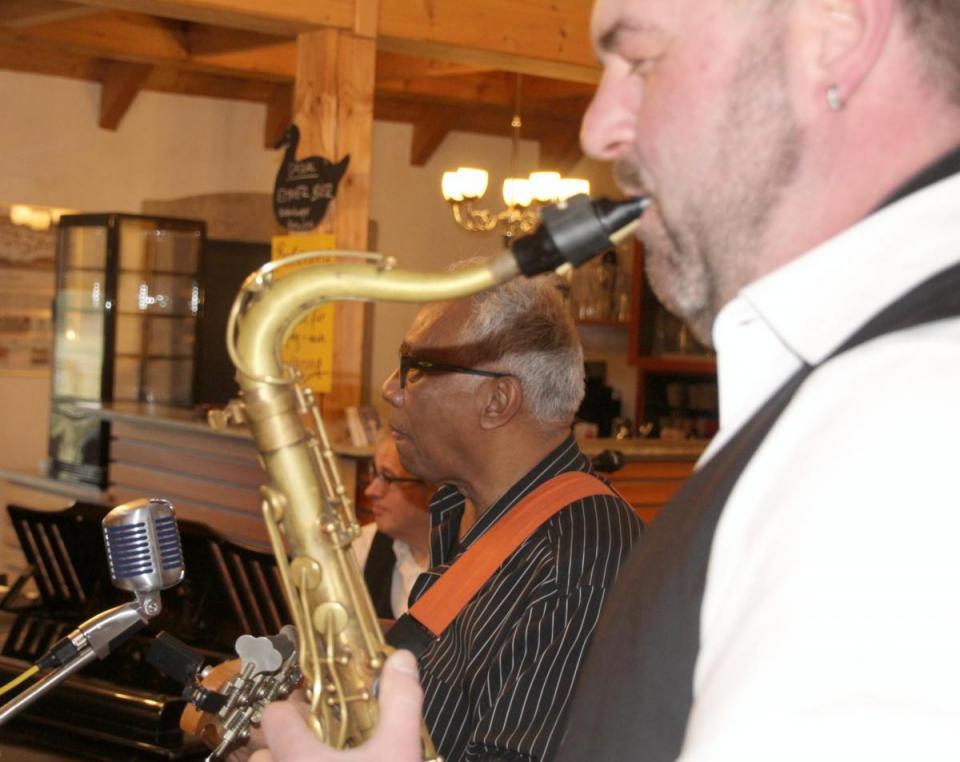 Gut 80 Gäste erleben im Café Federkiel zwei – wie es nicht nur die Hausherrin Astrid Kriechenbauer bezeichnete – „traumhafte“, vergnügliche Stunden trotz des Sturmes und Regenwetters. „Bertelshofer & Friends, das sind drei in ihr jeweiliges Instrument verliebte Vollblutmusiker, denen die Freude an ihren Weisen anzusehen ist, die Spaß daran haben, die Zuhörern zu verzaubern. Da ist zum einen der musikalische Leiter und begnadete Pianist Michael Bertelshofer aus Mantel, der dem Jahrzehnte alten Flügel im Lokal mit tanzenden Fingern die tollsten Töne und improvisatorischen Verzierungen wie Glissandos, Shakes und Rips entlockte und mit seiner gefühlsbetonten Stimme Evergreens und Popsongs wirkungsvoll interpretierte. Ihm zur Seite steht mit Cornelis Nanlohy O’Neal aus Grafenwöhr ein E-Bassist und Sänger, den man sowohl mit seinem Rhythmusgefühl und seinen betonten und geschmeidigen Walking-Bassläufen als auch seinem hellen, dynamischen Jazz-Gesang mit Übergängen in die Falsettstimme einfach bewundern muss. Und schließlich vervollständigt das Energiebündel Markus König von „King Size Musics“ aus Haselhöhe das Ensemble mit seinem Saxophon, mit dem er nicht nur leidenschaftlich die Melodien, sondern auch bei seinen Soli kreative Improvisationen präsentiert, in den höchsten Tönen, in rasantem Tempo, mal gegen den Rhythmus, mal mit ein paar Takten eines anderen Stückes, mal klagend, anschwellend oder gar wiehernd.