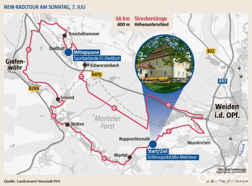 So starten die Radler am Sonntag, 7. Juli, um 10 Uhr an der Schlossgaststätte Melchner in Rupprechtsreuth. Anschließend führt sie die Strecke über Latsch, den Manteler Forst, Schwarzenbach, Dießfurt, Troschelhammer, Grafenwöhr, Gmünd und Hütten wieder zurück an den Startpunkt. "Die Strecke ist 56 Kilometer lang. Insgesamt sind unterwegs drei Pausenstationen geplant", erklärt Pressesprecherin Claudia Prößl. Für Kinder besonders wichtig: "Insgesamt sind nur 400 Höhenmeter Unterschied auf der Strecke zu bewältigen", informiert Prößl. Auch E-Bikes seien willkommen.