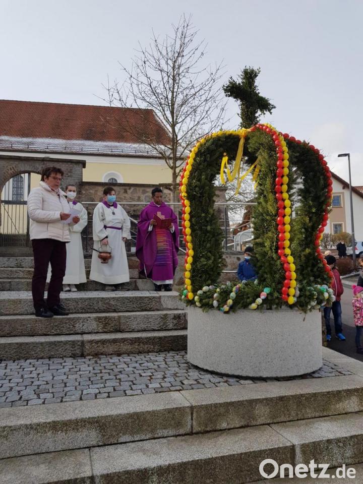 Im Anschluss an den Gottesdienst in Saltendorf zogen alle Gläubigen zur Osterkrone. Die Vorsitzende des Gartenbauvereins, Gertraud Schwarz, berichtete, dass bereits 2020 beschlossen wurde, eine Osterkrone aufzustellen. Dafür wurden mit den Kindern bunte Eier gefärbt. Allerdings wurde coronabedingt zunächst nichts daraus. Dieses Jahr konnte das Vorhaben aber endlich verwirklicht werden. Für die geleisteten Vorbereitungen bedankte sie sich bei Andreas Winklmann, Heinrich Eichinger, Georg Schwarz und Josef Birner. Ebenso bedankte sie sich bei allen mitwirkenden Frauen für das Besorgen der Zweige und das Binden und Schmücken der Krone.