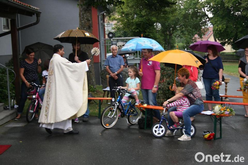 Am Ende weihte Pater Robin die Kräuterbüschel, die von der Gymnastikgruppe zum Kauf angeboten wurden. Danach wurden die verschiedenen Fahrzeuge wie Laufräder, Fahrräder, Kinderbulldogs und Kettcars, die die Kinder zum Gottesdienst mitgebracht hatten, gesegnet. Jedes Kind erhielt eine Christophorus-Plakette für sein Gefährt.