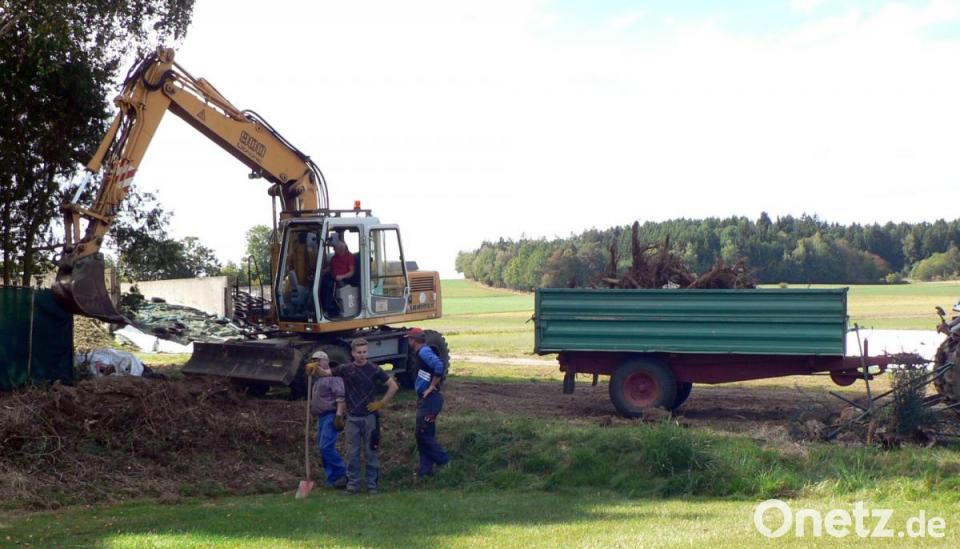 Am Freitag trafen sich freiwillige Helfer, um mit den Erdarbeiten zu beginnen. Die Männer brauchten sich dabei nicht nur auf ihre Muskelkraft zu verlassen, sondern wurden von einem Bagger sowie einem Traktor mit Kipper unterstützt. Gleichzeitig wurden in der Dorfmitte die Bretter für den Sichtschutzzaun gestrichen. Dank des sonnigen Wetters trocknete das Holz besonders schnell.