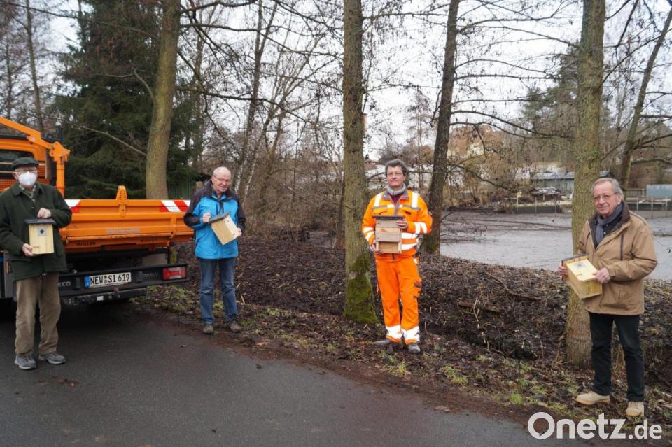 An Stelle der Kinder nahmen nun die die aktiven Zukunftswerkstatt-Mitglieder Baumgartner, Peter Reim und Richard Wittmann zusammen mit Gemeindearbeiter Karl Bodensteiner die Gelegenheit wahr, 15 Vogelnistkästen im Schirmitzer Wald entlang des Ringweges anzubringen. Alle Nistkästen hat Baumgartner selbst gebastelt. Wer einen solchen Nistkasten wünscht, kann sich bei ihm melden und einen solchen für eine kleine Spende erwerben. Baumgartner hat zu Hause noch Nistkästen gelagert. Da im März die Nistzeit für die einheimische Vogelwelt beginnt, wurden die künftigen Brutstätten für die Vögel jetzt rechtzeitig angebracht. Die Mitglieder der Zukunftswerkstatt dankten bei der Aktion für die Unterstützung durch die Gemeinde.