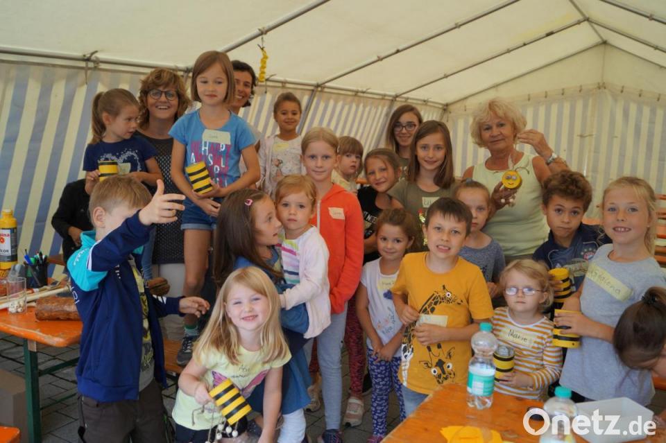 Büchereileiterin Marieluise Uebelacker und ihre Mitarbeiterinnen Christa Schläger, Annemarie Fink, Kathrin Knorr und Anne Bodensteiner sowie einige Eltern bastelten mit den Kindern Bienen aus Blechdosen. Sie bemalten die Behälter zunächst mit gelber und schwarzer Farbe. Dann fügten sie Füße, Flügel, Fühler und Augen an. Zuletzt wurden die "Bienen" innen mit Holzwolle für die Ohrwürmer ausgefüllt. Die jungen Bastler wurden mit Kuchen, Schnittchen und Limo gestärkt.