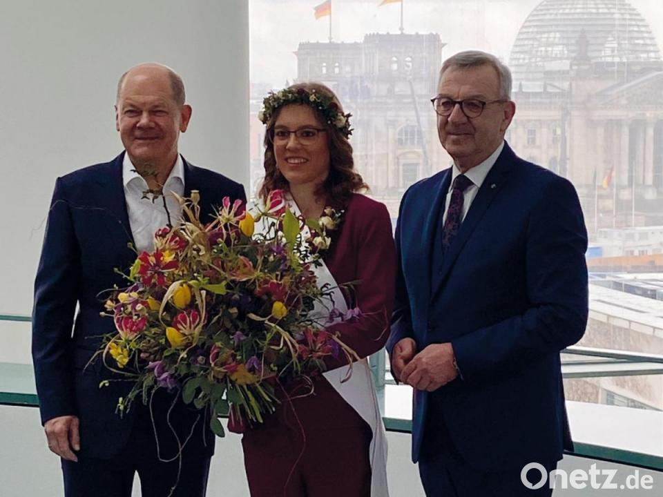 Kathrin Köhler aus Schirmitz ist amtierende Blumenfee. Seit September 2023 repräsentiert sie mit diesem Ehrenamt den Zentralverband Gartenbau (ZVG). Am Valentinstag besuchte die 25-Jährige zusammen mit ZVG-Präsident Jürgen Mertz Bundeskanzler Olaf Scholz in Berlin. Dabei liegt natürlich nahe, dass eine Blumenfee auch den passenden Blumengruß dabei hat. Kathrin Köhler habe einen fröhlich anmutenden, luftigen Frühlingsstrauß mit besonderen Akzenten zusammengestellt, heißt es in einer Pressemitteilung. „Besondere Blumen für eine besondere Person“, lautete das Motto. Der Strauß enthielt die Ruhmeskrone (Gloriosa) und die japanische Ranunkel. Außerdem repräsentierte er die Fachrichtungen des Gartenbaus. Dazu zählten Obstgehölze, Scabiosen, Nelken, getrocknete Kräuter, Gloriosen und Ranunkeln. Die Schirmitzerin verwendete Regionales und Saisonales aus dem eigenen Garten und der Gärtnerei vor Ort.