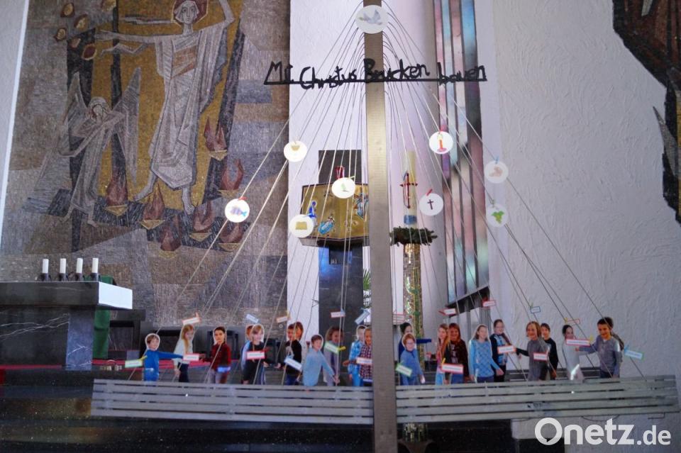 Mit Christus Brücken bauen“ lautete das Motto im Familiengottesdienst in der Pfarrkirche. Viele Blicke zog eine große Hängebrücke am Seitenaltar auf sich, auf der 22 Buben und Mädchen aus Schirmitz und Bechtsrieth/Trebsau neben ihren lebensgroßen Pappkameraden standen. In der Messe sprachen die Kinder Fürbitten und baten den Herrn mit „Hilf uns, Brücken bauen“, um Beistand. Am Sonntag, 5. Mai, werden sie erstmals an den Tisch des Herrn treten. Die jungen Christen, die nach den Worten von Pfarrer Thomas Stohldreier jetzt fester Bestandteil der Pfarrgemeinde sind, stellten im Predigtspiel fünf verschiedene Brückenmodelle als Symbole zur Hilfestellung im Leben vor. Die Kinderschola unter Leitung von Wolfgang Ziegler am Piano gestaltete die Eucharistiefeier mit rhythmischen Liedern.