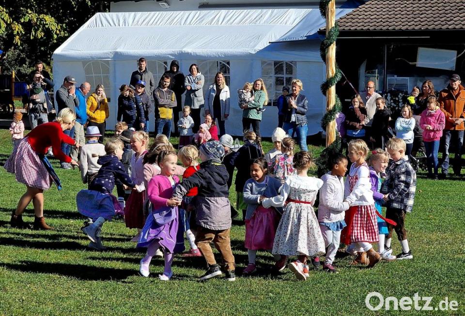 "Hoffentlich bleibt es regenfrei", war die Sorge der Eltern des Kindergartens „Maria Königin“. Die 22 Vorschulkinder hatten sich vorbereitet zum Tanz um den aufgestellten Kirwabaum. Bald darauf war aufatmen angesagt: Das Wetter hielt, es blieb trocken. Der „Bayerische Defiliermarsch“ führte die Kinder auf die Wiese zum weiß-blau geschmückten Kirwabaum, auch ein Kranz pendelte unterhalb der Spitze.