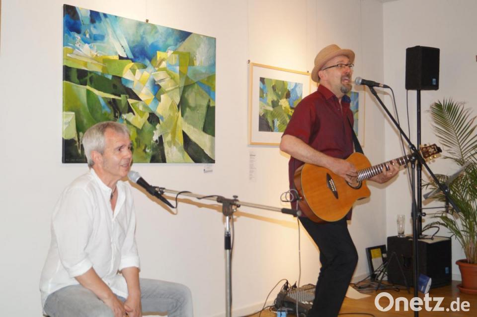 Dabei unterstützte ihn Maler Klaus Kuran an den Percussioninstrumenten. Kurans Werke sind bereits seit einer Vernissage Anfang Mai im Bürgersaal ausgestellt. Das Motto des Abends „Lieder wöi g'malt“ war daher vorgegeben.