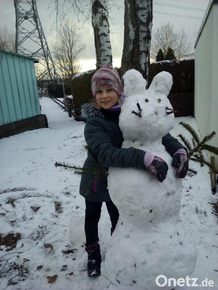 Lena Peetz aus Schirmitz ist eine sehr verantwortungsvolle Hasenmama. sie besitzt zwei Zwerghasen, "Flecki" und "Conny". Lena hofft, dass ihr Schneeflecki noch lange stehen bleibt und nicht wegtaut.