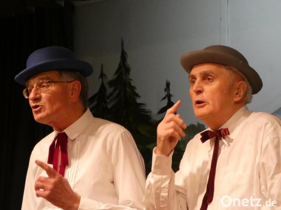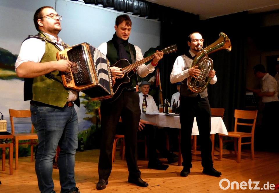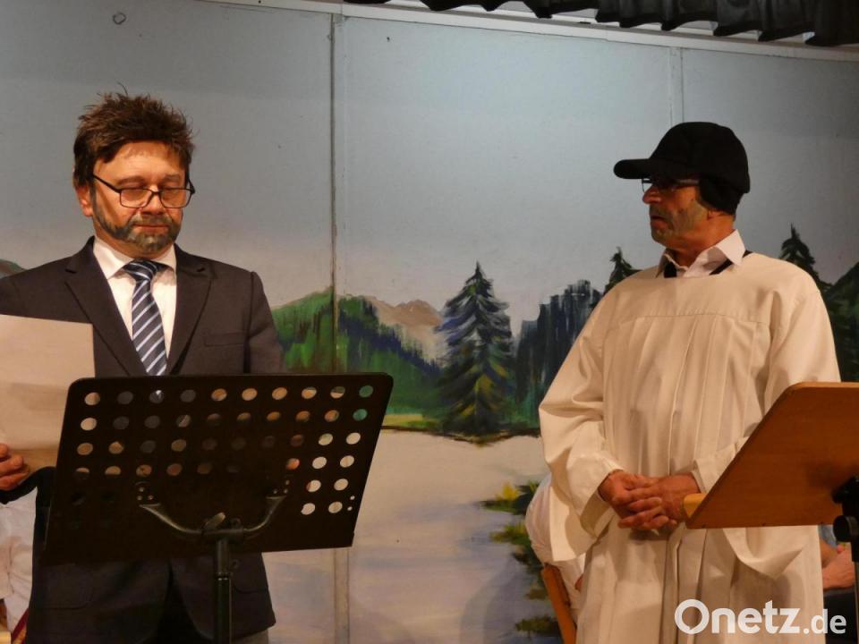Die Wadlbeißer (Andreas Melischko, Michael Ziegler, Thomas Ziegler), eine weitere in der Gemeinde bereits bekannte Gruppe, bereicherten das Programm mit zwei Stücken aus ihrem Repertoire. „Mei Kua hat rote Gummischua“ und „Nix Amore“. Einen weiteren Höhepunkt setzte Joachim Pachale. Der MGV-Sänger trug das Lied „Der Neubau der hooche“, ein Titel von der Mainzer Fasnacht, vor. Der absolute Glanzpunkt des Abends war der Auftritt von Wolfgang Bäumler und Thomas Lindner als Pfarrer Thomas Stohldreier und als Bürgermeister Ernst Lenk. Mit ihren Darstellungen hatten beide die Lacher auf ihrer Seite. Den Schlusspunkt der gelungenen Veranstaltung bildete das Lied „Freunde, ja heute feiern wir“, bei dem alle Gäste kräftig mitsangen.