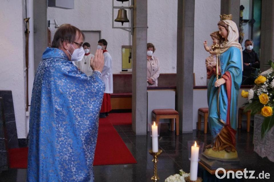 Die Schirmitzer Pfarrkirche ist das einzige Gotteshaus in der Diözese Regensburg, das der Himmelskönigin geweiht ist. Die feierliche Prozession zur Pfarrkirche fällt heuer trotzdem schon zum zweiten Mal aus. Dennoch begeht die Pfarrei das Kirchenpatrozinium mit einem festlichen Gottesdienst. Die Marienfigur mit dem Jesuskind, die sonst immer von Mitgliedern der Kolpingsfamilie bei der Prozession mitgetragen wurde, stand neben dem Hochaltar. Sie wurde beim von Pfarrer Thomas Stohldreier gesegnet.