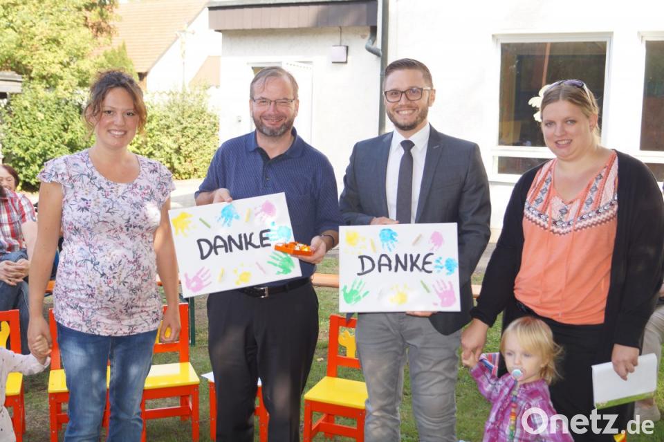 Bürgermeister Lenk freute sich über das Zustandekommen der neuen Eltern-Kind-Gruppe und dankte allen, die zum Gelingen der Feier und des in frischen Farben getünchten Gruppenraums beigetragen hätten. Dabei lobte er besonders den Einsatz der Gemeindearbeiter. Für die Unterstützung seitens der Gemeinde und der Pfarrei bedankten sich die Leiterinnen bei Pfarrer und Bürgermeister. Kinder überreichten symbolisch Süßigkeiten und Bildtafeln mit großer Aufschrift "Danke". CSU-Chef Dobmeier übergab eine Spende an die Leiterinnen der Eltern-Kind-Gruppe.