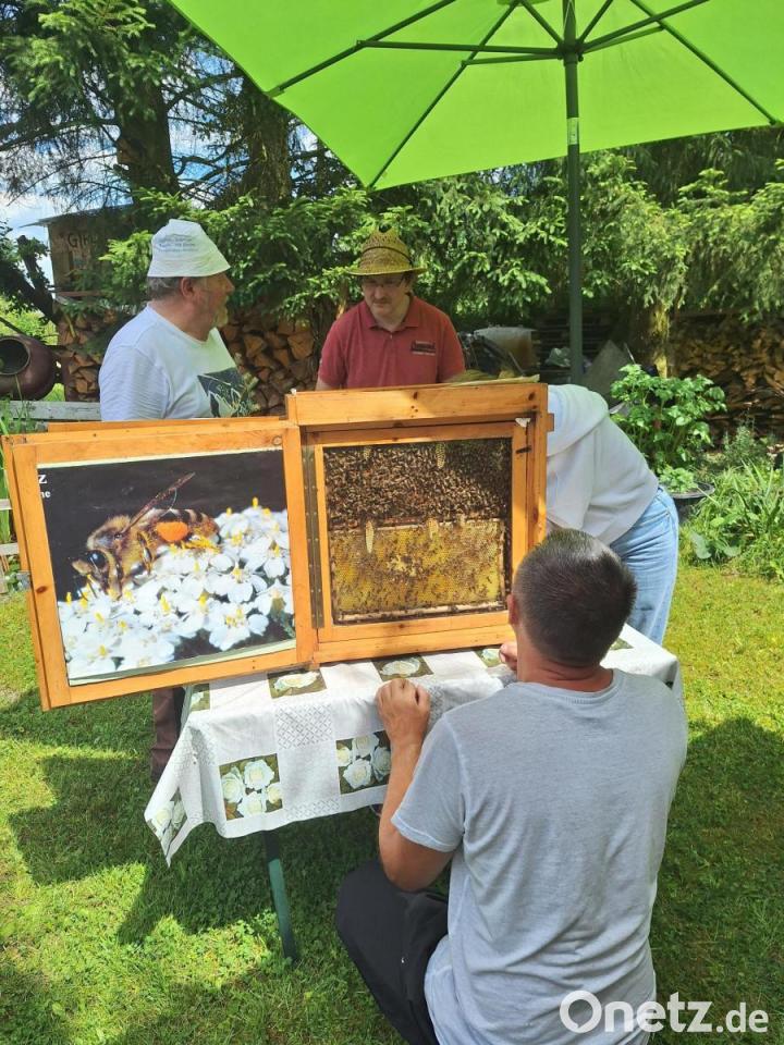 Wo kommt der Honig her und wie funktioniert das mit dem Bestäuben? Diesen Fragen ging der Obst- und Gartenbauverein Schirmitz in zwei Gruppen mit jeweils etwa 20 Teilnehmern auf den Grund. Siegfried Maier senior vom Bienenzuchtverein Weiden, lud ein, seine 35 Bienenvölker zu besichtigen. Nach einem Rundgang mit fachlicher Einführung wurden die Honigwaben aus den Kisten genommen. Die Teilnehmer staunten nicht schlecht, als der Imker mit einer großen Bürste, die Bienen von ihren Waben entfernte.