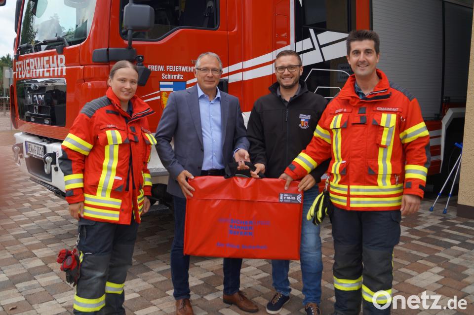 Kommandant Bernhard Eckert und Stellvertreterin Carola Adam sowie Bürgermeister Ernst Lenk bedankten sich bei der Übergabe des "mobilen Rauchverschlusses" am Gerätehaus durch den Direktionsbeauftragten der Versicherungskammer Bayern, Andreas Krenn, für die Spende. Untergebracht wird der Rauchvorhang künftig an einem Schlauchtragekorb auf dem Feuerwehrauto.