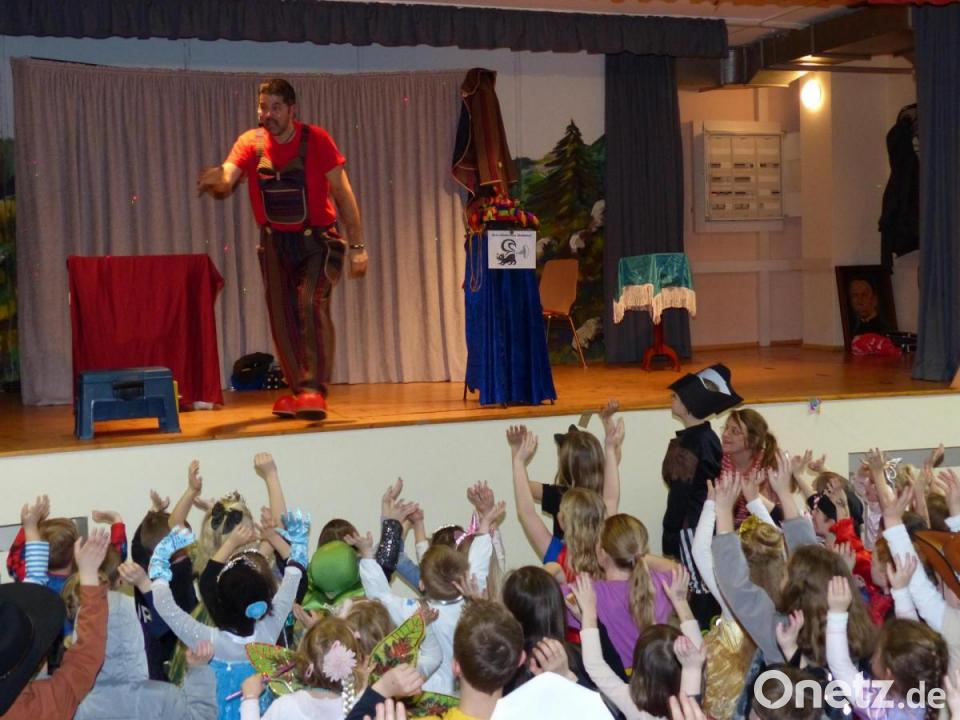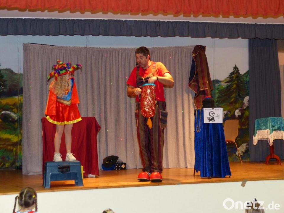 Feiern und Herumtollen macht nicht nur durstig, sondern auch hungrig. Kindern geht es da nicht anders als Erwachsenen. Dagegen half ein Gang zum gut bestückten Kuchenbüfett oder zu den belegten Wurstsemmeln. Mit Spielen vertrieben sich die Kinder die Zeit, bis der Star des Nachmittags, der Zauberer vom Hexenberg die Bühne betrat. Der Schirmitzer Nachwuchs versammelte sich gespannt vor der Bühne. Er konnte es kaum erwarten, bis der Vorhang aufging und der Zauberer auf der Bühne stand. Mit seinen Versprechern entzauberte der Künstler den Kinder stets ein lautes Geschrei. Ein Zauberer braucht unbedingt eine Hilfe bei seiner schweren Aufgabe und so durften ihm einige Besucher auf der Bühne zur Seite stehen.