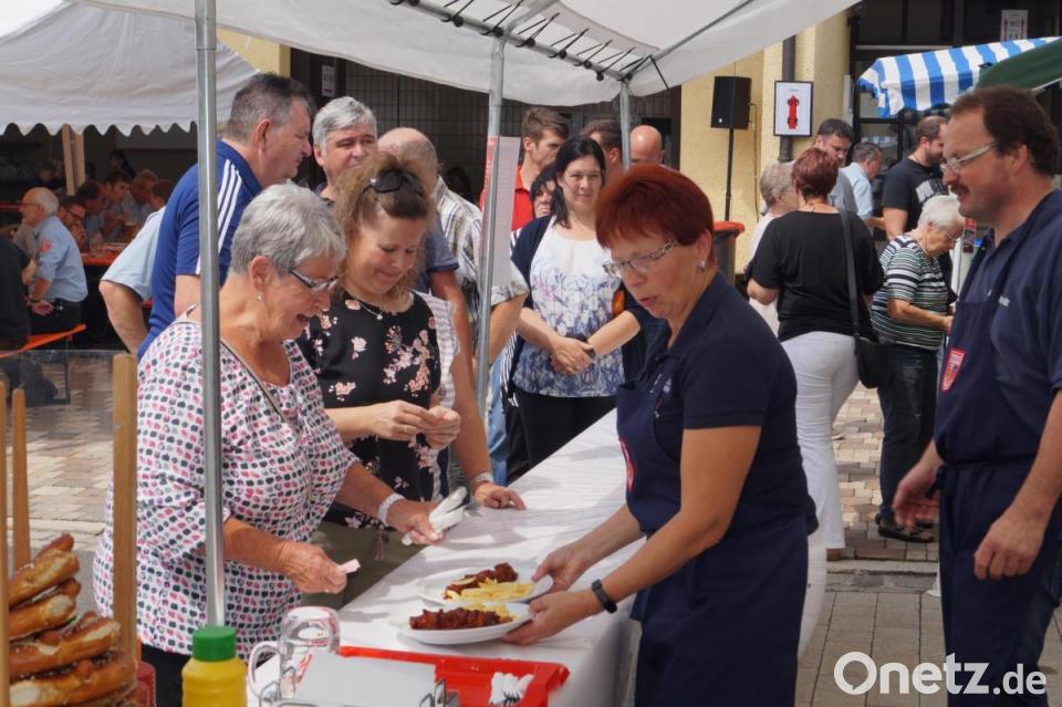 Bereits zum anschließenden Frühschoppen im großen Zelt vor dem Gerätehaus hatten sich Gäste von der Patenwehr aus Irchenrieth sowie der Feuerwehr Bechtsrieth eingefunden, später auch von der Feuerwehr Rothenstadt. Den vielen Besuchern servierten die Helfer zum Mittagessen Grillfleisch und Steaks sowie Bratwürste vom Grill. Für ein besonders Schmankerl aber standen die Gäste Schlange, nämlich für Schaschlik mit Pommes. Die Fleischspieße waren so begehrt, dass die Nachfrage auch am Abend noch groß war. Außerdem gab es Käse und Brezen.