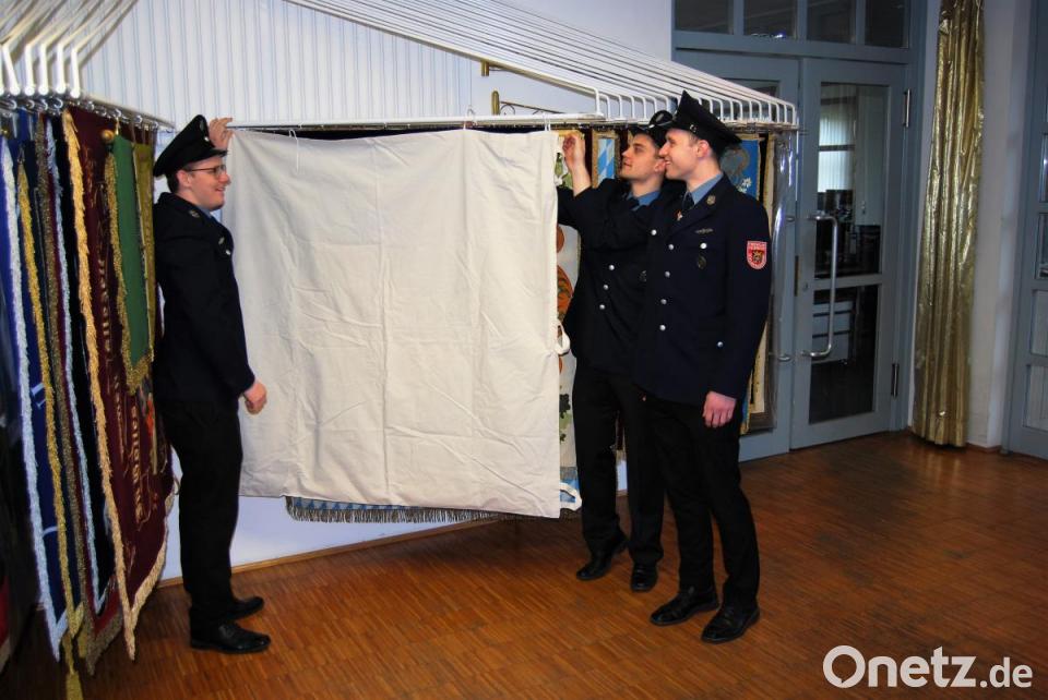 Bevor die Fahne übergeben wurde, machten sich die Brandschützer bei einer Betriebsbesichtigung ein Bild davon, in welch aufwendiger und filigraner Arbeit eine handgestickte Fahne hergestellt wird. Dann war es endlich soweit: Das Banner wurde offiziell in Empfang genommen. Nico Lautner, Daniel Radke und Stefan Thaller, die drei Mitglieder der Fahnenabordnung, enthüllten vor den Augen der Mitgereisten das neue Prachtstück.